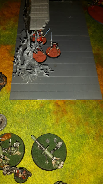 On the other flank, the Infiltrators fired at the Lascannon team, killing one of the squad. They then performed a disordered charge on the Lascannon team and Company Command squad. The Infiltrators killed the Lascannon team, the Company Command striking back and killing one of the Infiltrators. The Command squad failed their morale check and were slain as they tried to flee.