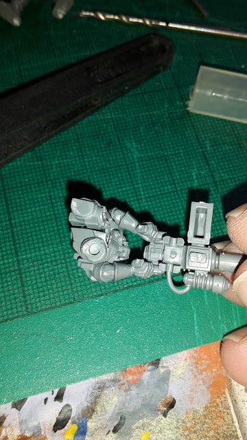 Assemble the Heavy Stubber gunner (Part 2a in the instruction manual). Drill a 2 mm hole in one of the legs with your pin vice.