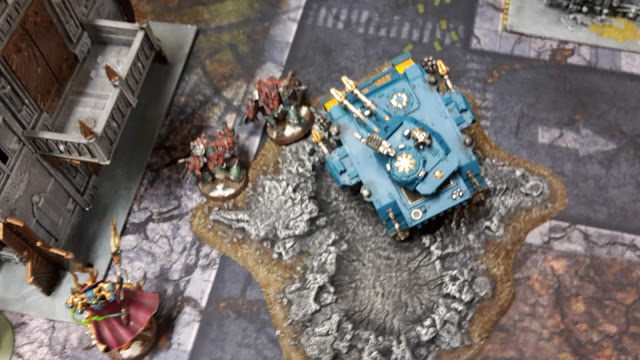In the psychic phase, Ahriman cast Temporal Manipulation on the warlord Daemon Prince, healing 3 wounds on him. He then attempted to cast Warptime on the Obliterators, but failed to manifest the power. He also failed to cast Prescience on the Predator, using a command point re-roll, but failing to manifest the power.