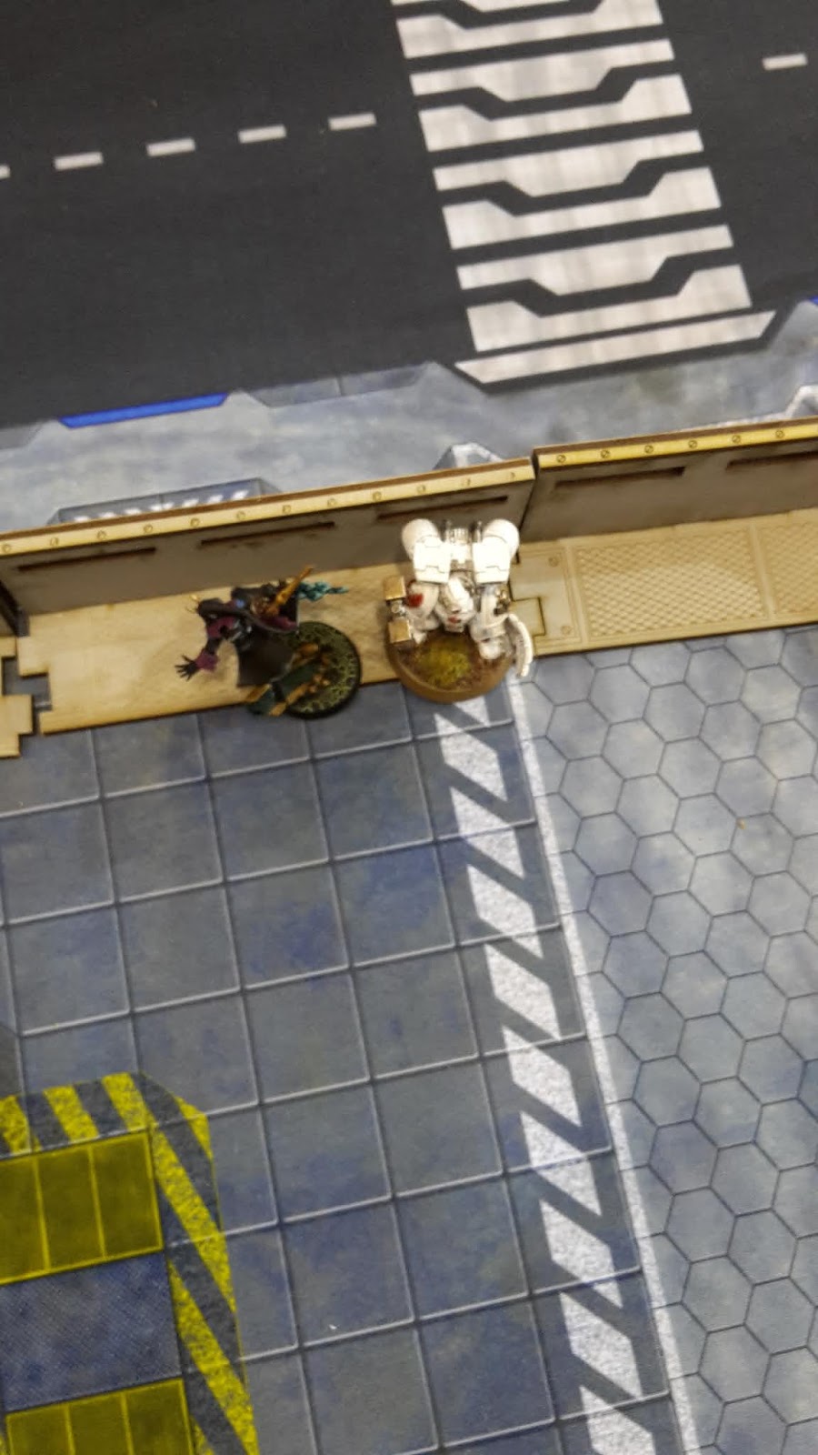 In the charge phase, the Inceptors failed a charged on the Death Jester. The Chaplain and Biker Captain charged the other Death Jester, while the Chapter Master and Lieutenant assaulted the Hornet.