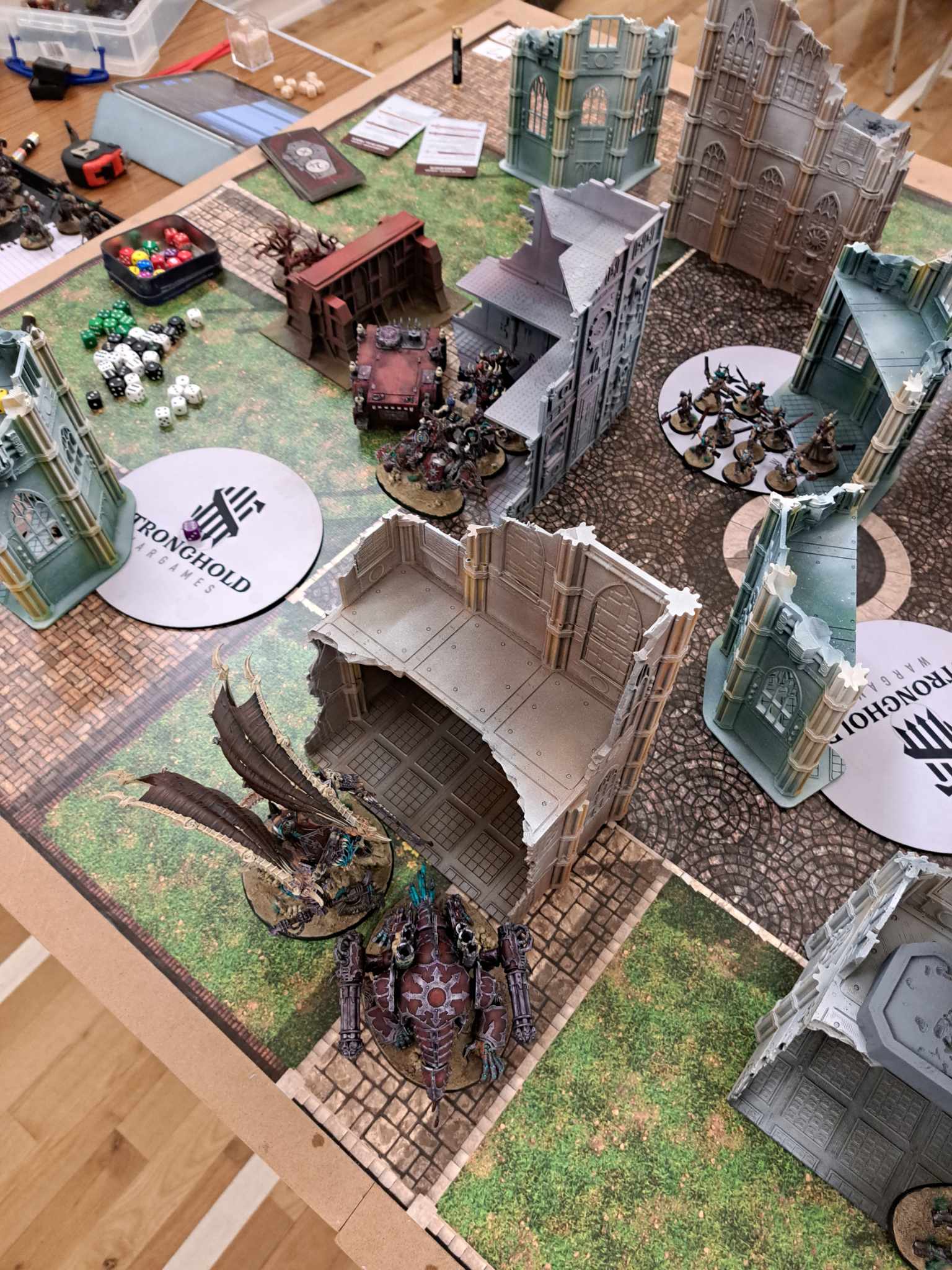 I got the first turn and moved up to stage behind the ruins. The Eightbound and Juggernaught Lord killed the Lictors. The Forgefiend was able to kill two of the Von Ryans.